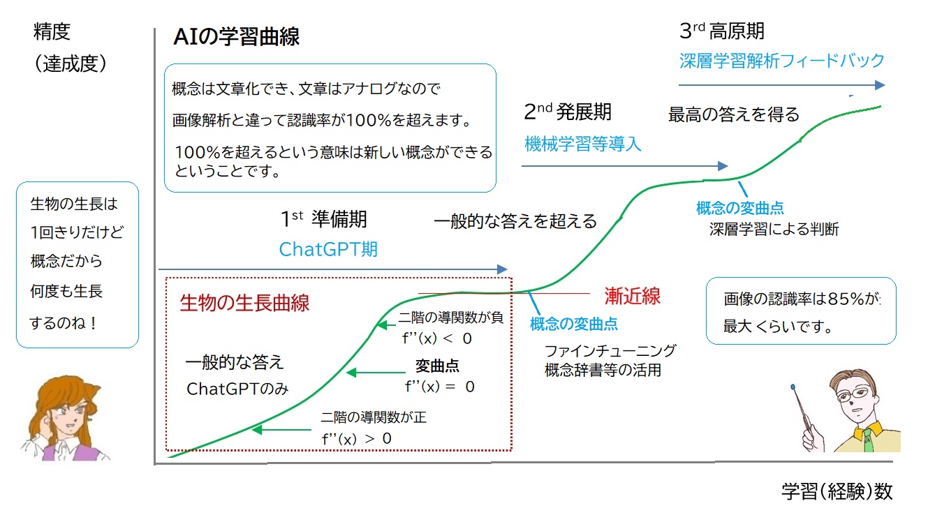 生物の一世代の生長は準備期だけですが、世代を超えて発展期、高原期と適正し変化していきます。AIもChatGPTから始まり、概念辞書、深層学習などの変曲点を経てビジネスが可能になるモデルが出来上がります。
