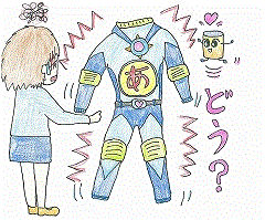 「もぅー、あつこはにぶいんだから。これを着て、スーパーあつこになるのよ!そうして飛んでいって、あの人たちを助けるの。さぁ、早く、早く!」