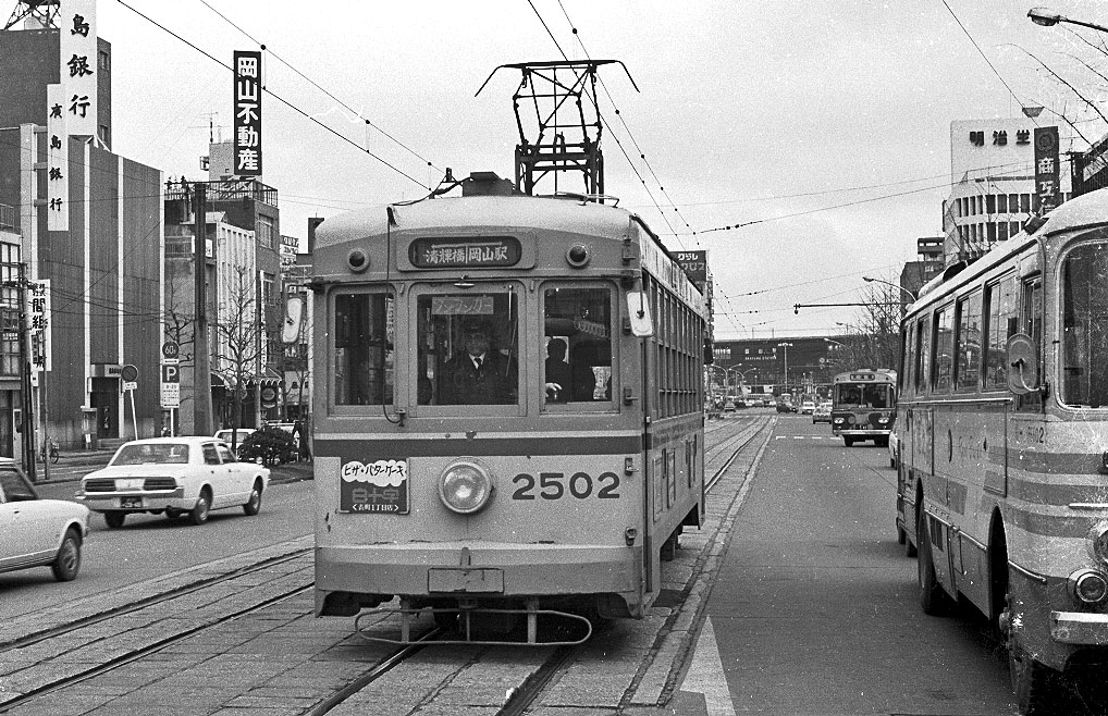 廃止された東武鉄道日光線から大量の100形を譲受して2軸単車を一掃して近代化を図りました。訪問当時は多くが広告電車として活躍していました。岡山駅前