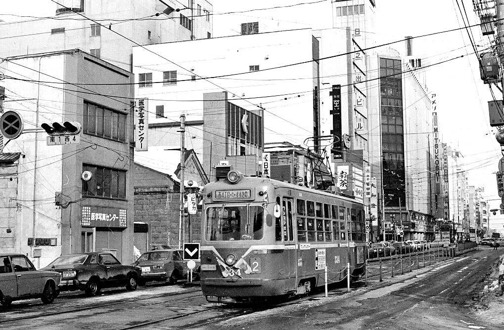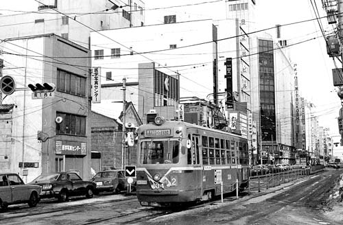 | 札幌の市電を撮影したのは後にも先にもこの時だけとなっています。路線は既に現在と同じ規模に縮小され、特徴的な連接車の姿も見られなくなっていました。2月の3連休、雪景色を求めて渡道しましたがこの年は暖冬で札幌市内の雪も溶けかけの最悪の状況でした。この日は天候も曇り空から時折雪が降ってくるような状況で、写真の出来映えは最悪です。 |